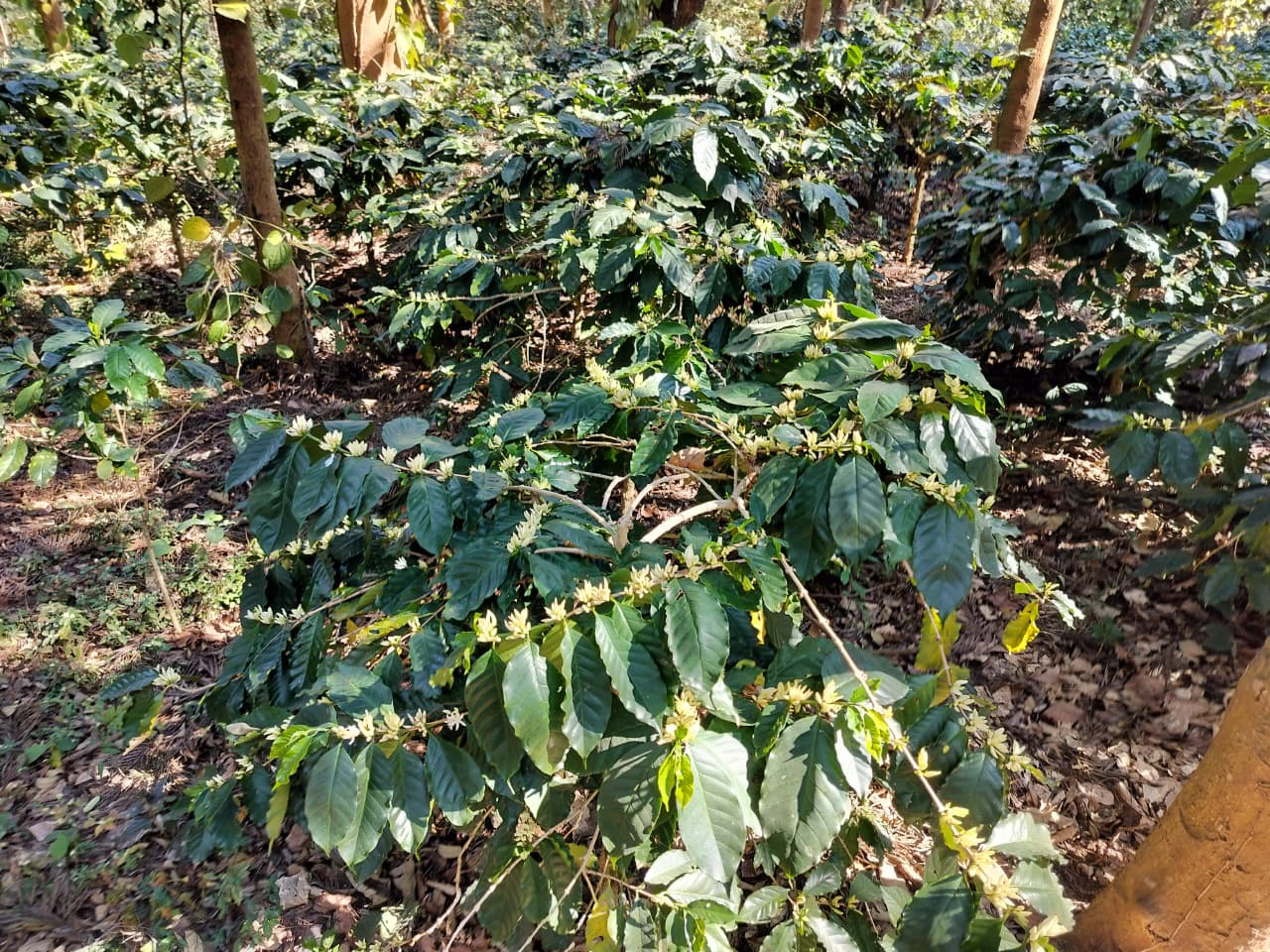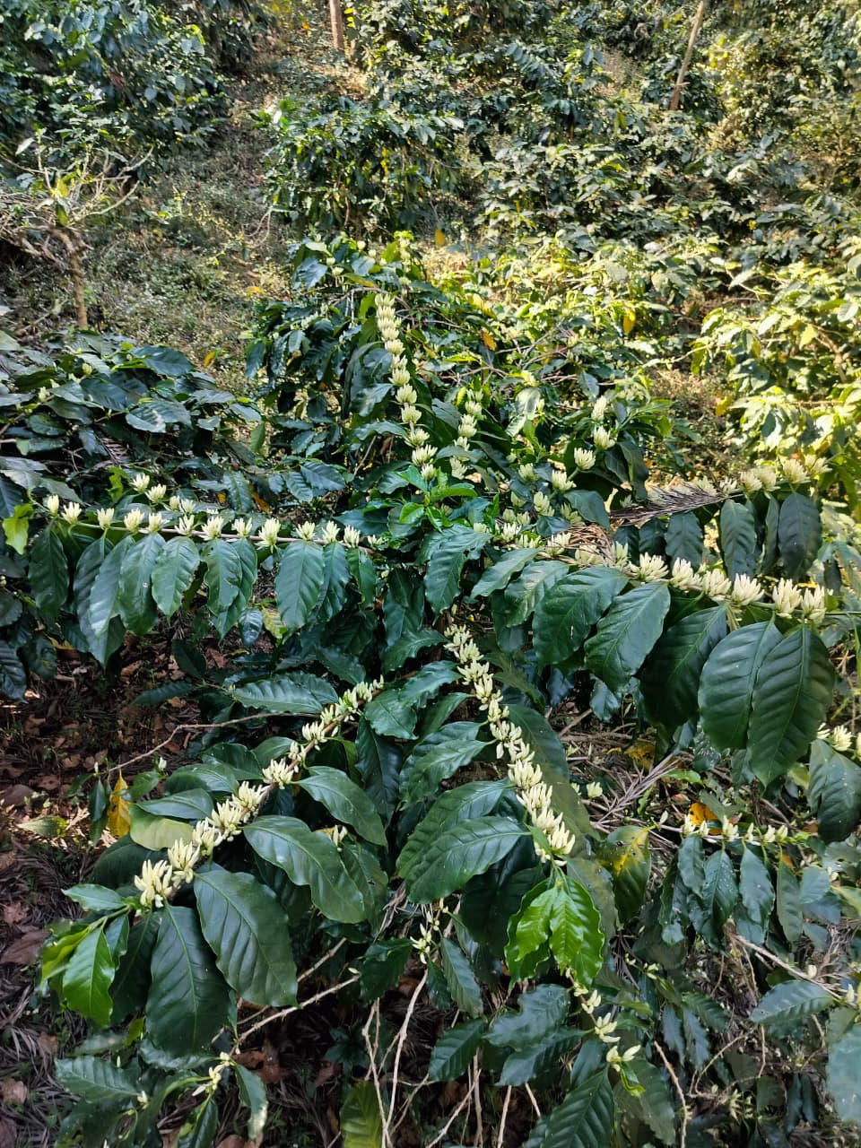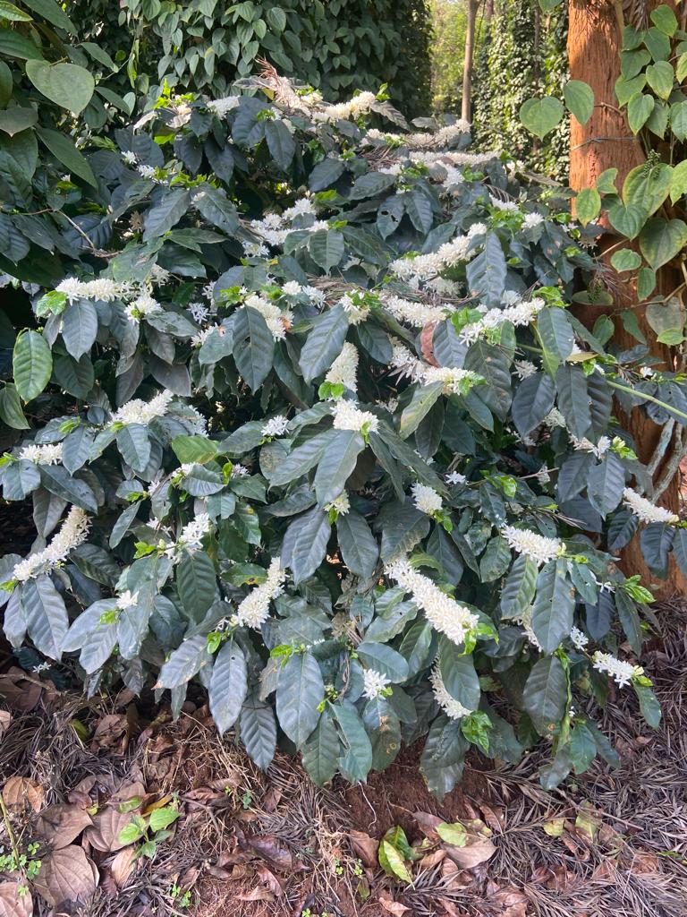 Seasonal rains trigger beautiful white coffee blossoms and healthy pepper spikes. This stage defines the future quality and aroma of the produce.
